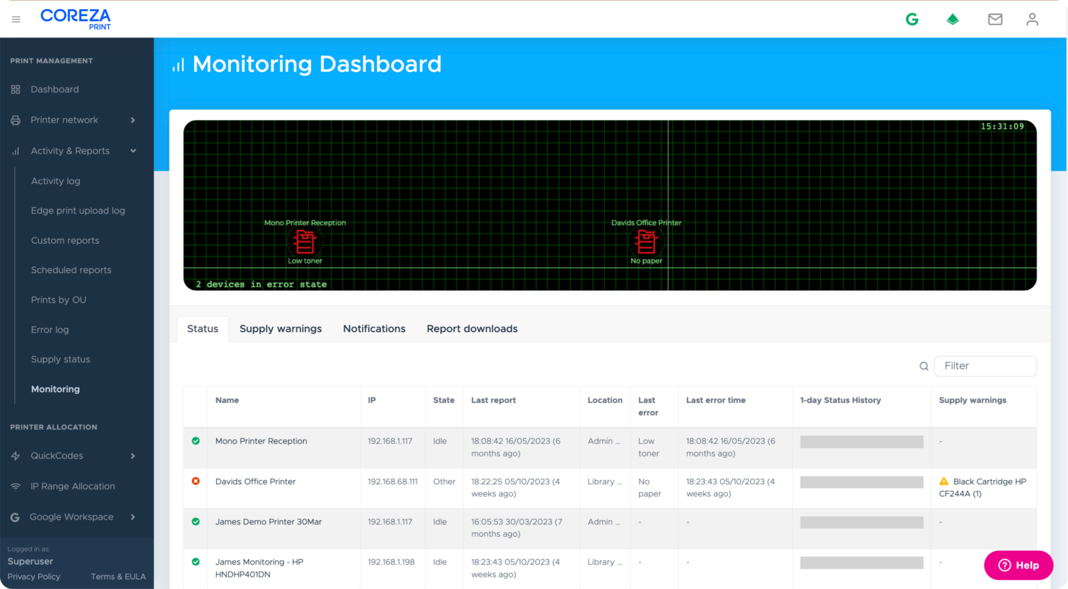 Printer monitoring is an additional add-on to our fully featured Coreza Print print management solution. Click here to view our pricing.